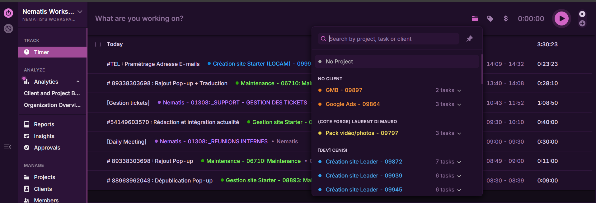 2. Liste des projets et tâches associées à sélectionner dans Toggl Tracker :