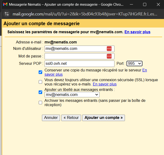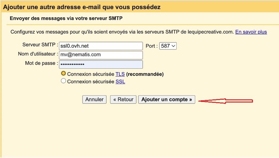 - Nom : avec le nom que vous souhaitez afficher lors d’un envoie de mail.