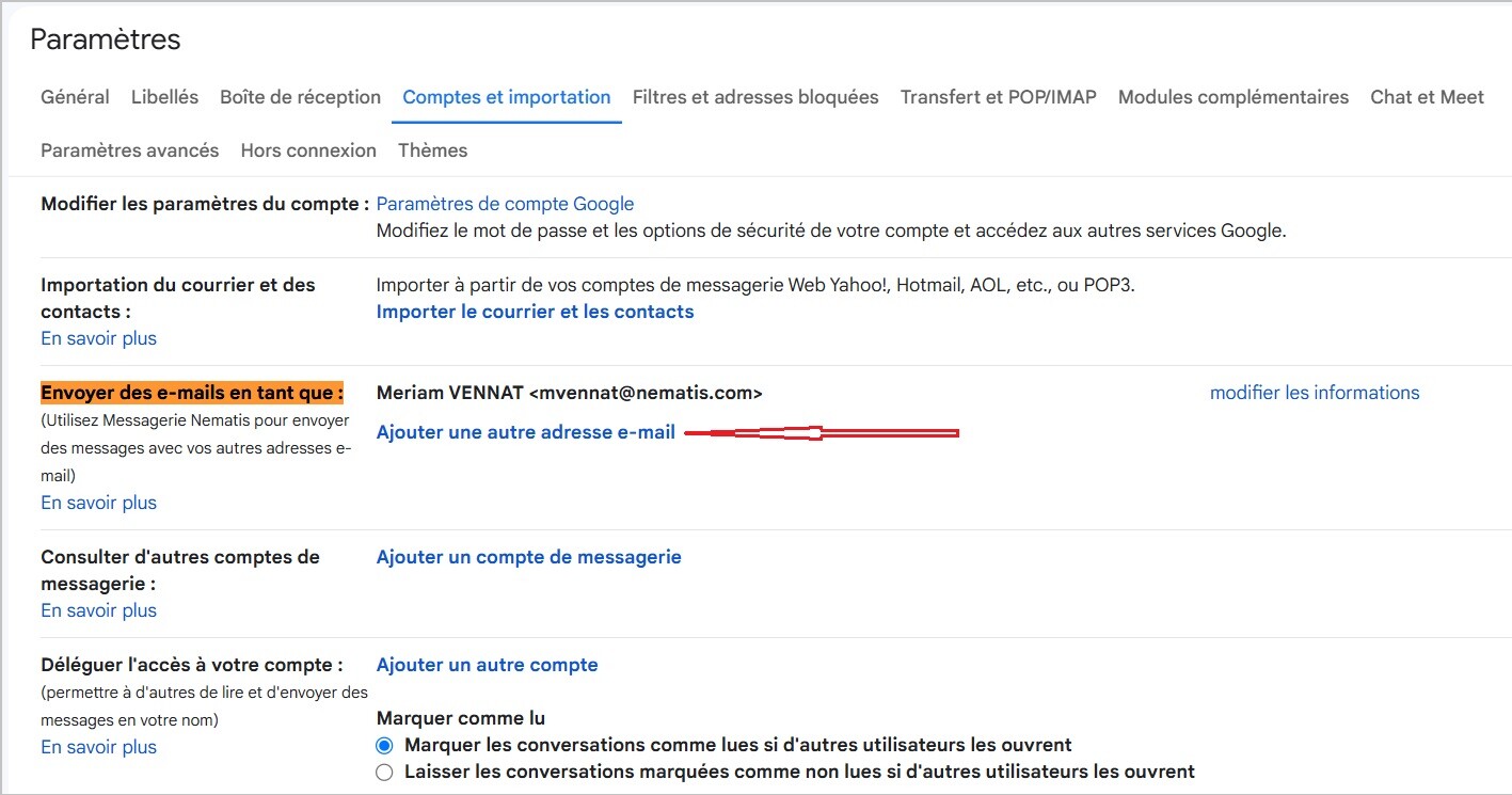 Ou retournez dans "comptes et importations" puis rendez-vous dans la rubrique “Envoyer des email en tant que“ et cliquez sur Ajouter une autre adresse e-mail.