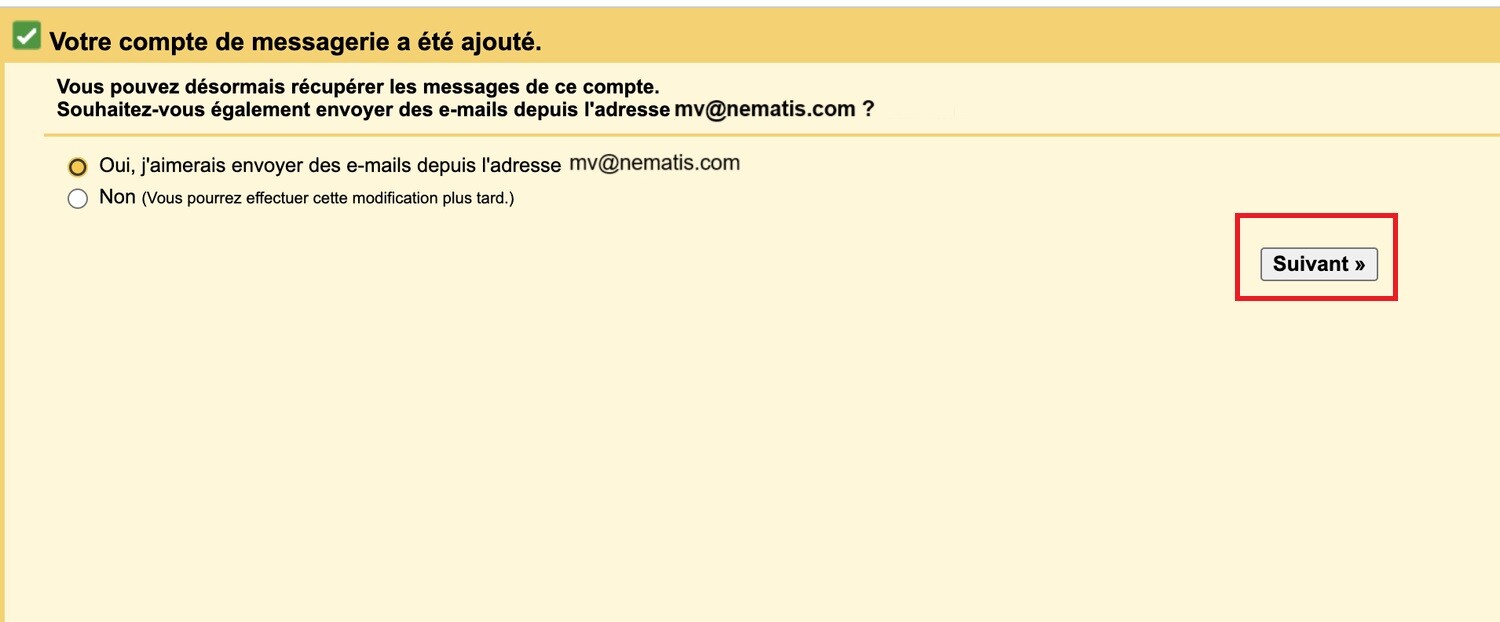 - Continuez le processus en paramétrant l’envoie d’email depuis cette adresse en cliquant sur “Oui, j’aimerais envoyer des e-mails depuis l’adresse …”