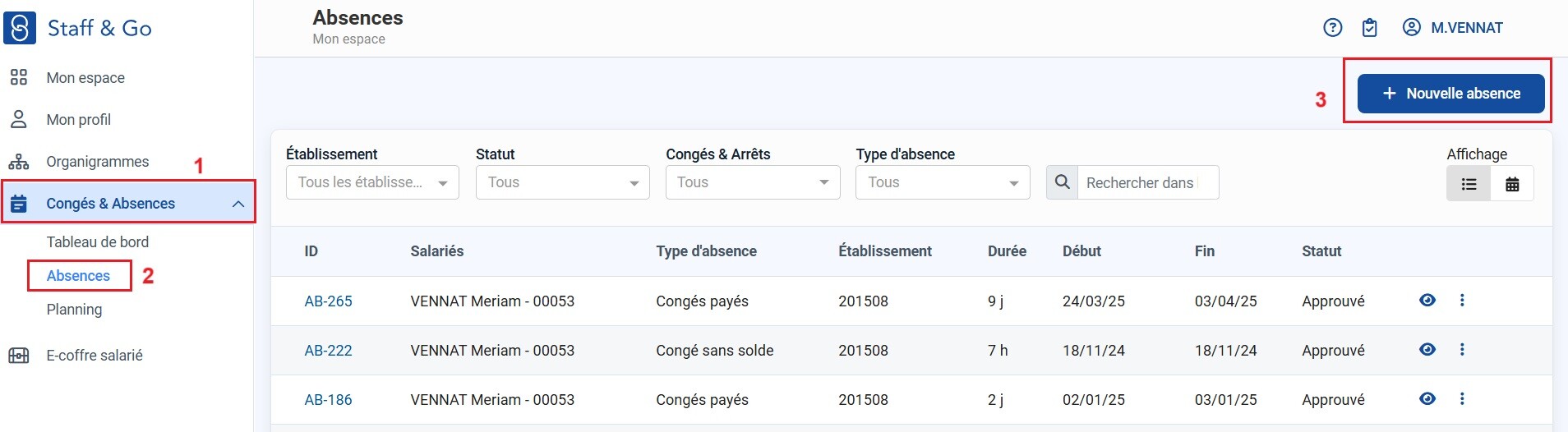 Étape 2 : Cliquez sur le bouton « + Nouvelle absence »