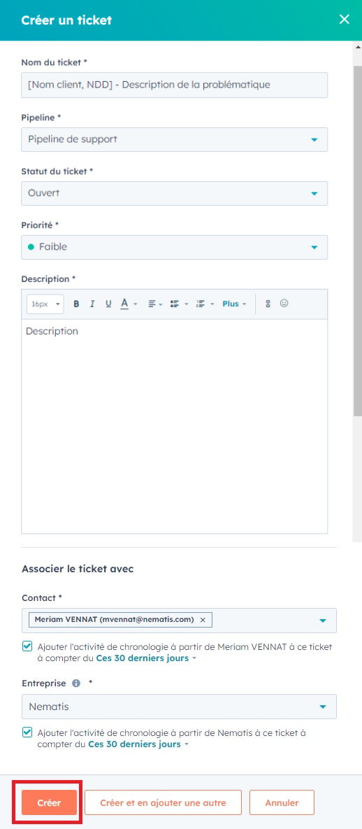 Attention :Lors de la création d'un ticket, il est essentiel de commencer par renseigner d'abord le contact. Si le contact n'est pas trouvé, il est nécessaire de le créer avant de procéder à la création du ticket (Procédure ici)