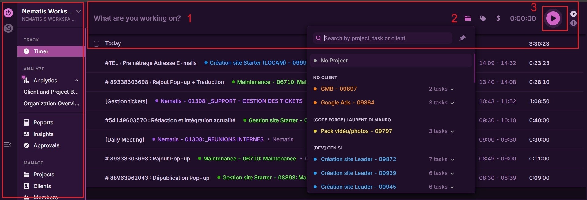 2. Liste des projets et tâches associées à sélectionner dans Toggl Tracker :